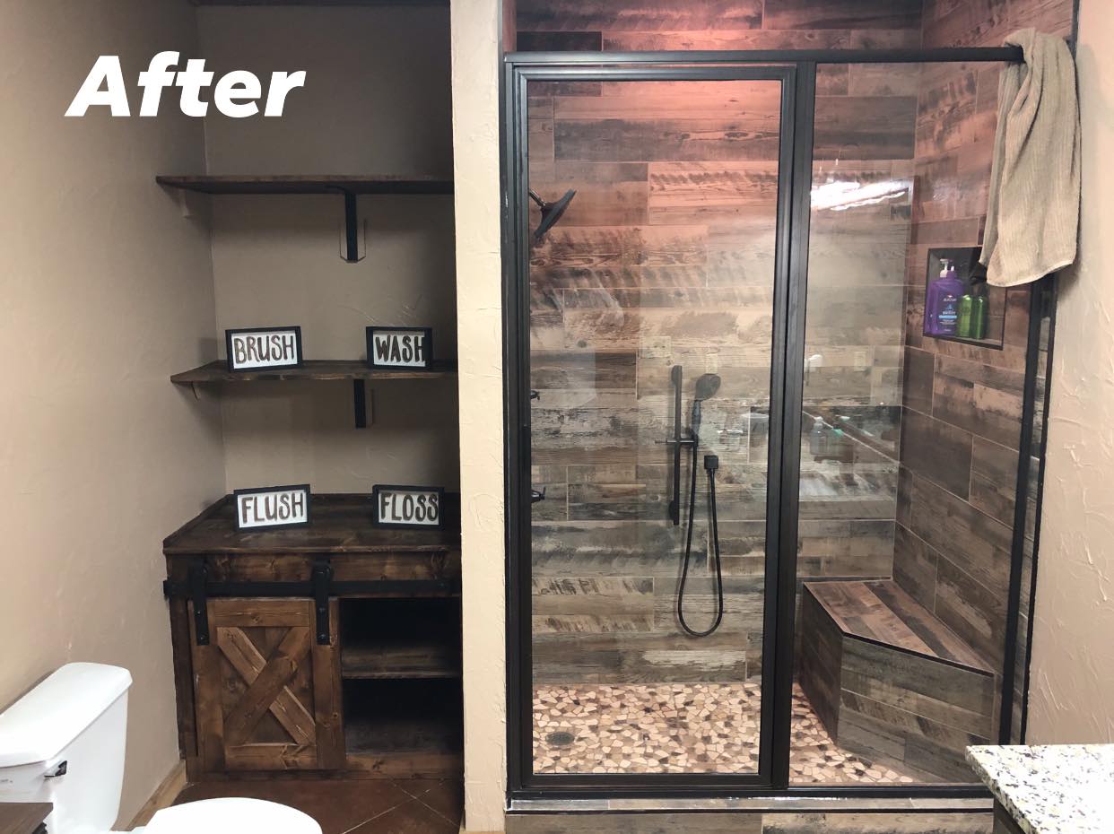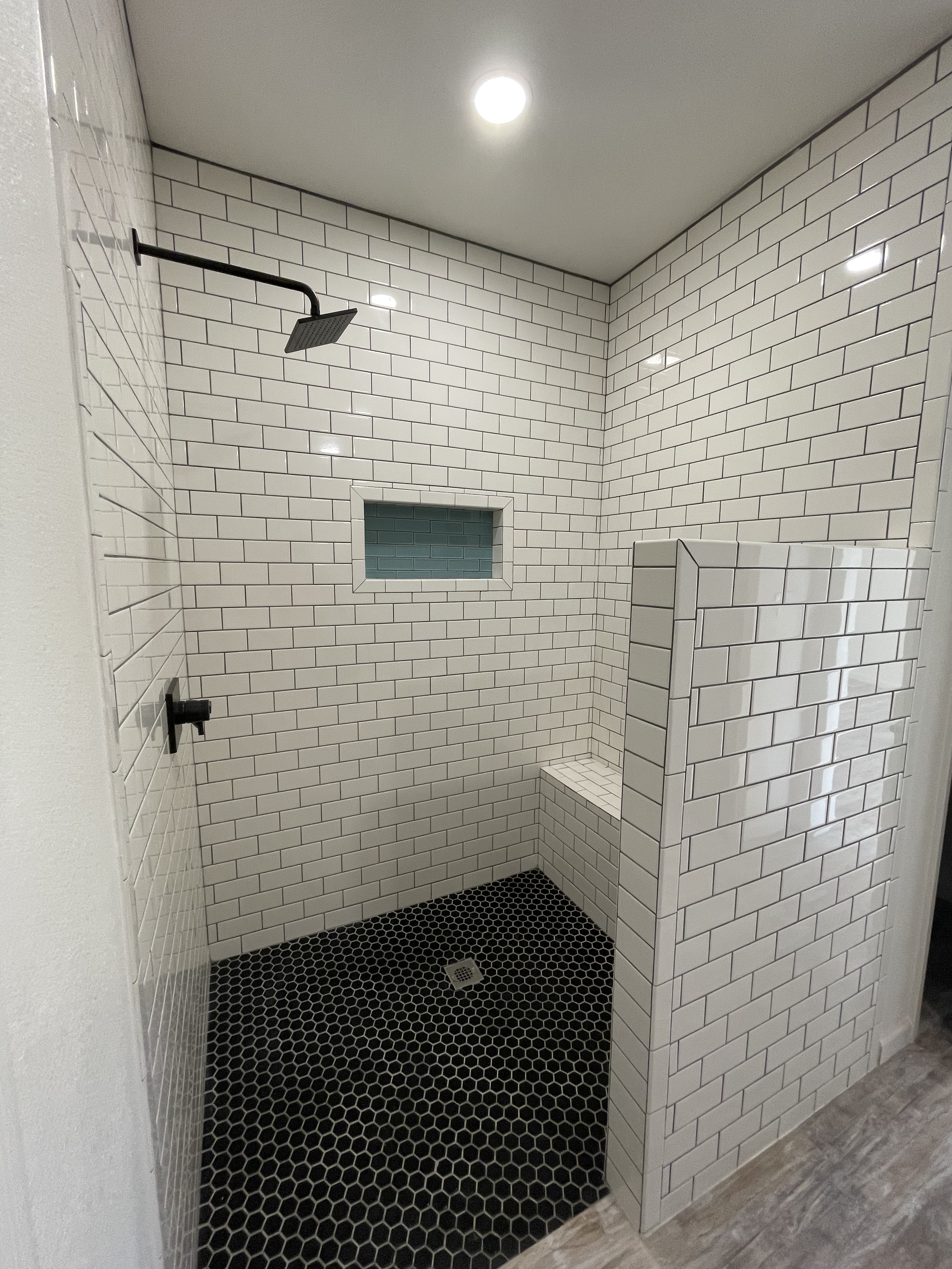 Custom barndominium shower with bench seating