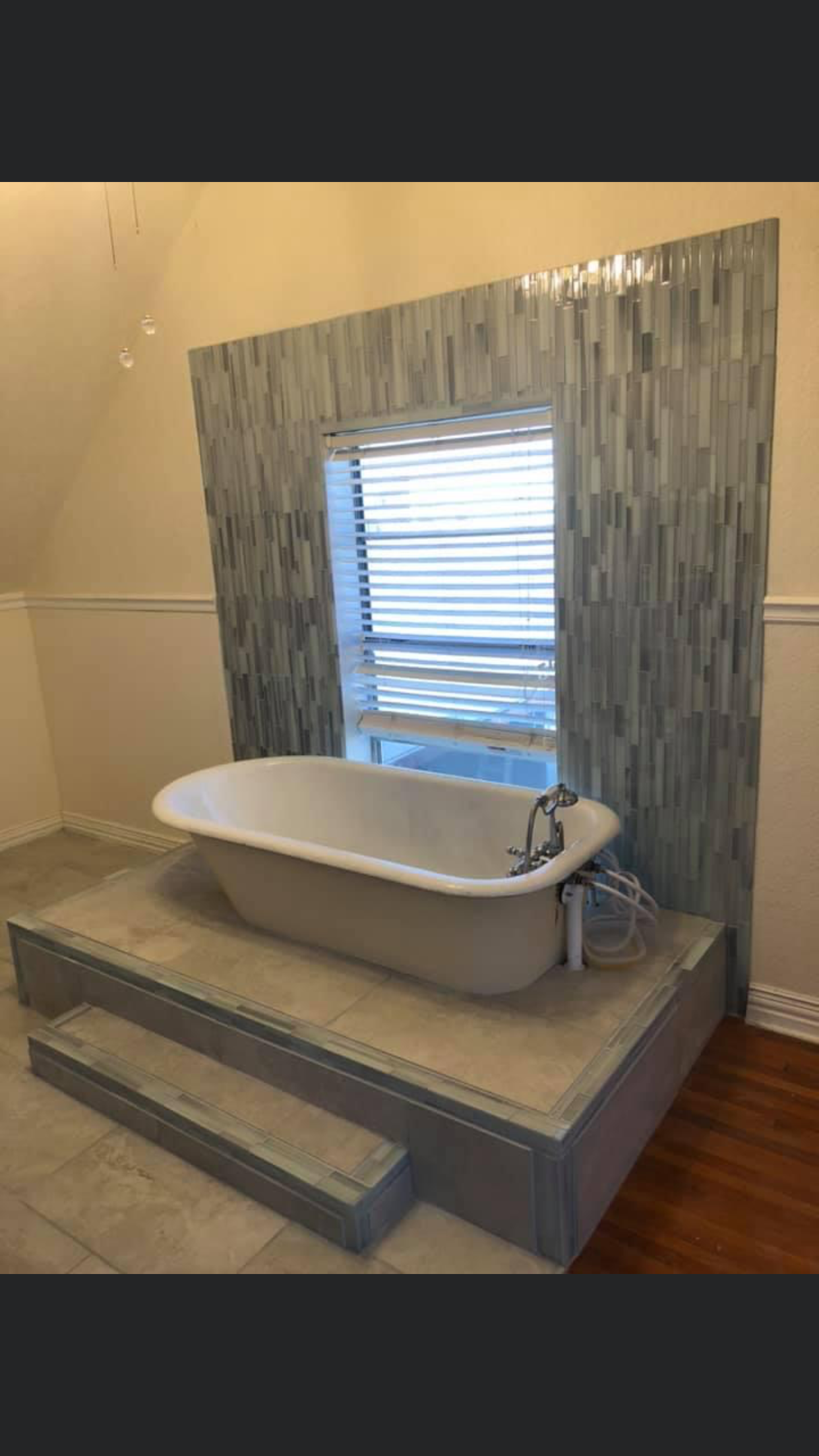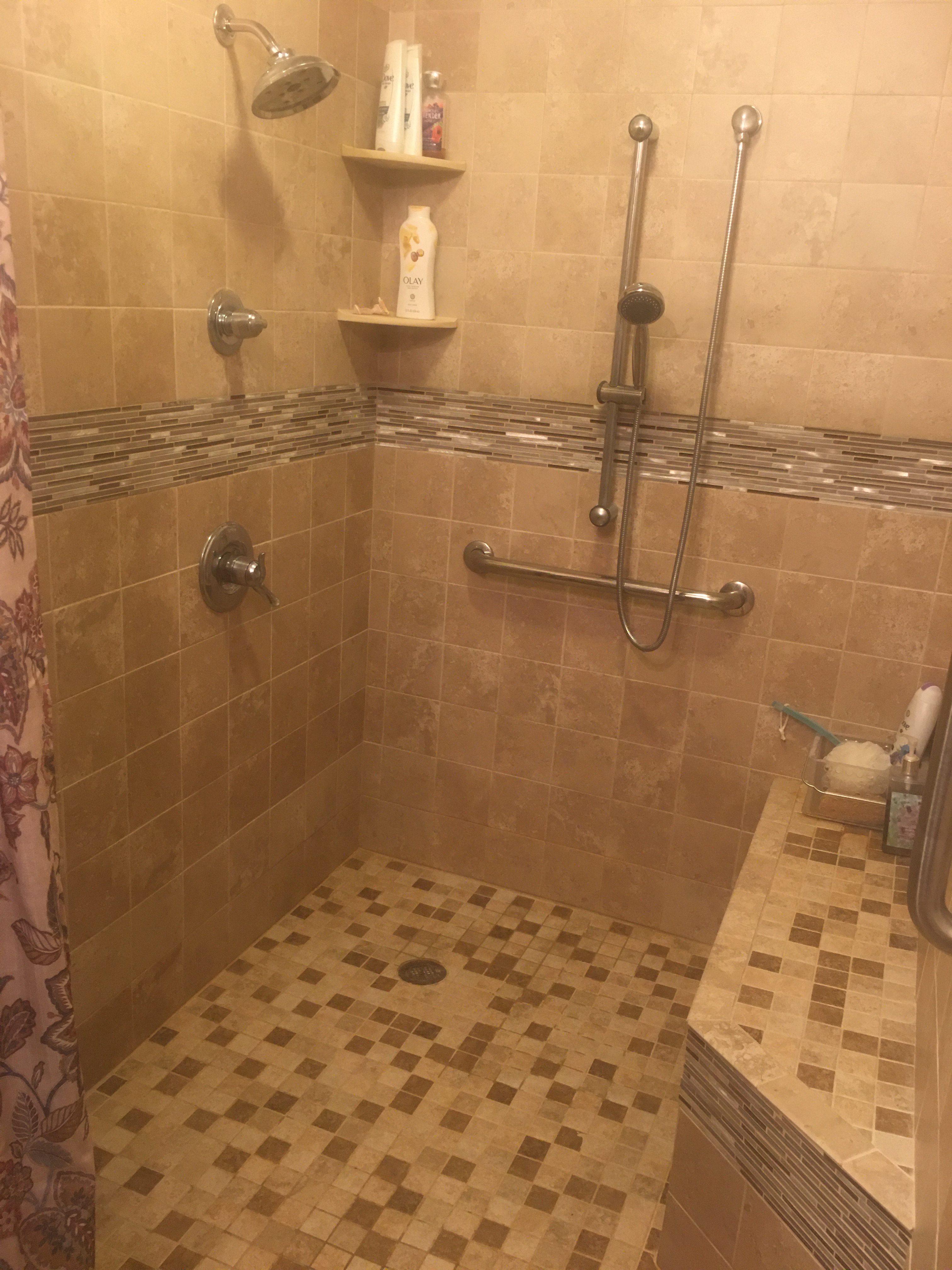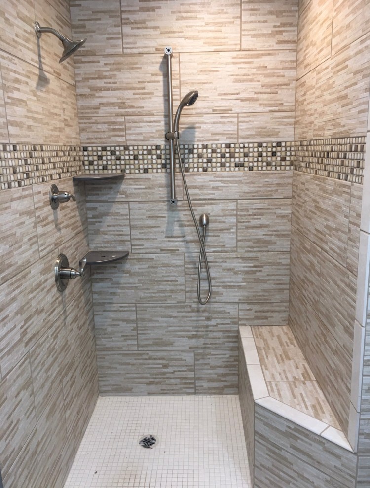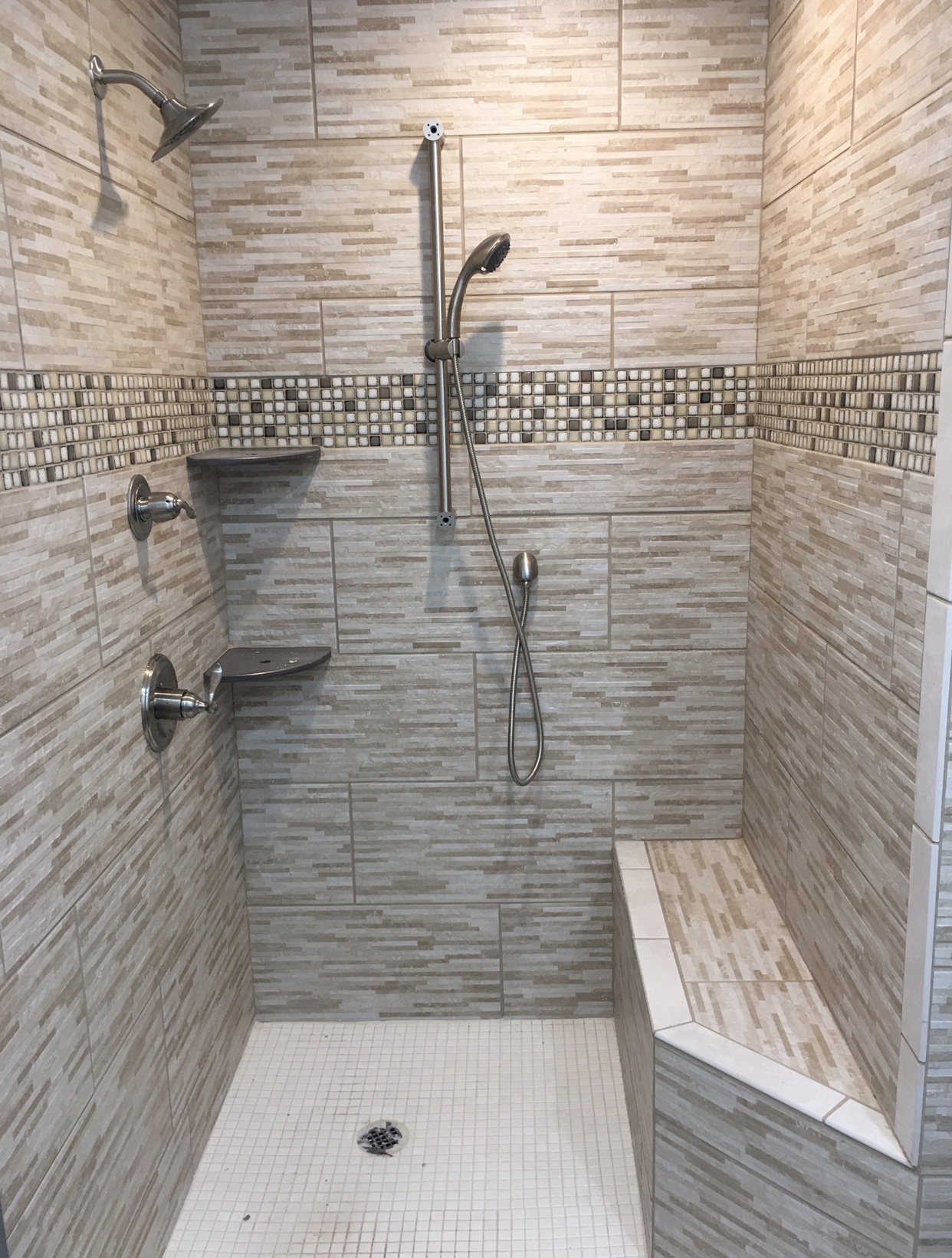 custom shower with glass mosaic tile and bench seat
